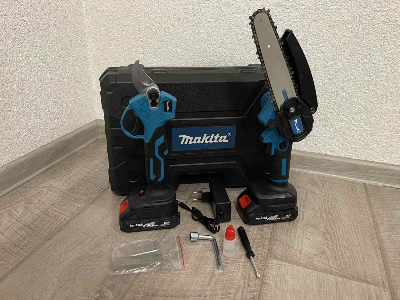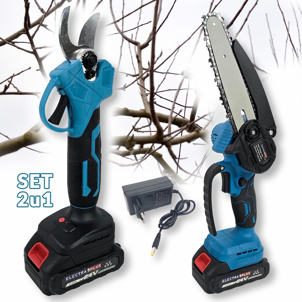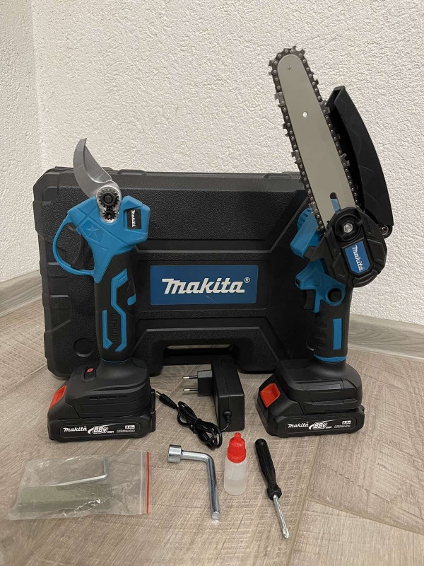 – U setu dolazi: Aku Pila i Aku Makaze, 2x Baterija, Punjač i Kutija sa alatom ( Šarafciger, Inbus ključ, Okasti ključ, Ulje i Kamen za oštrenje)